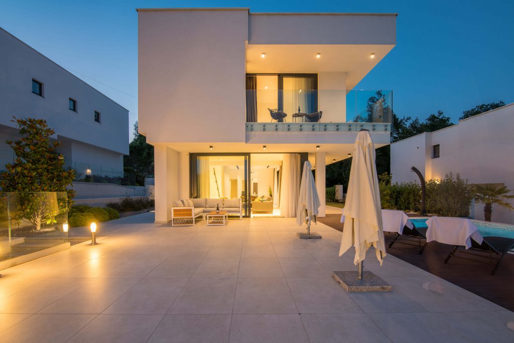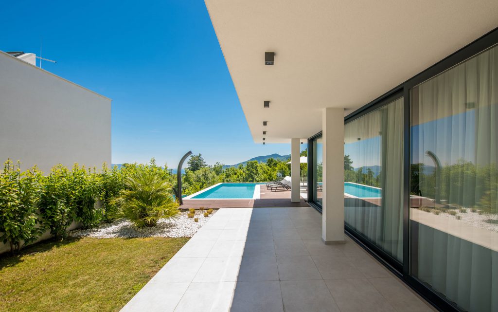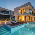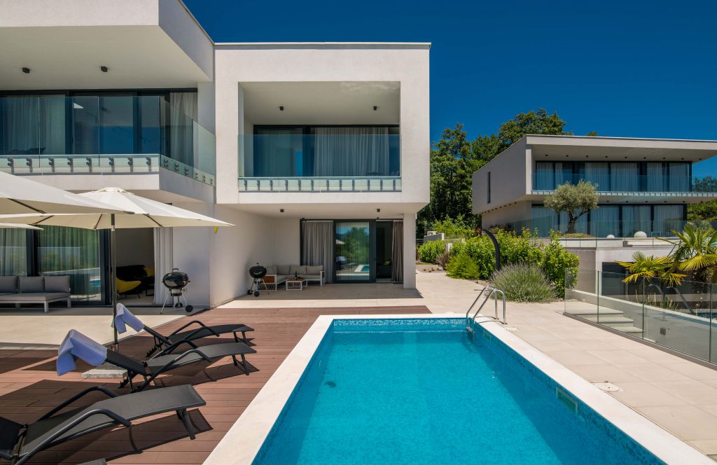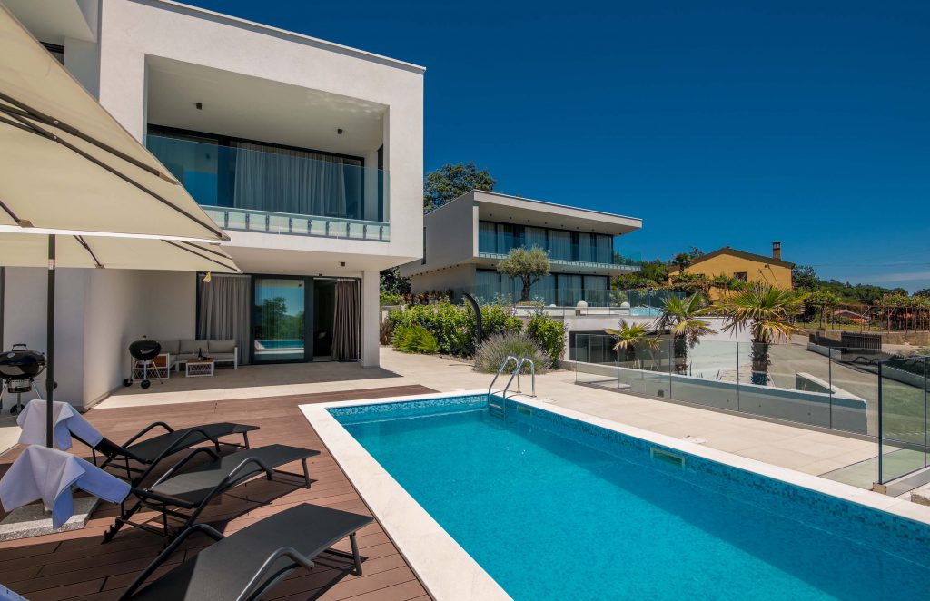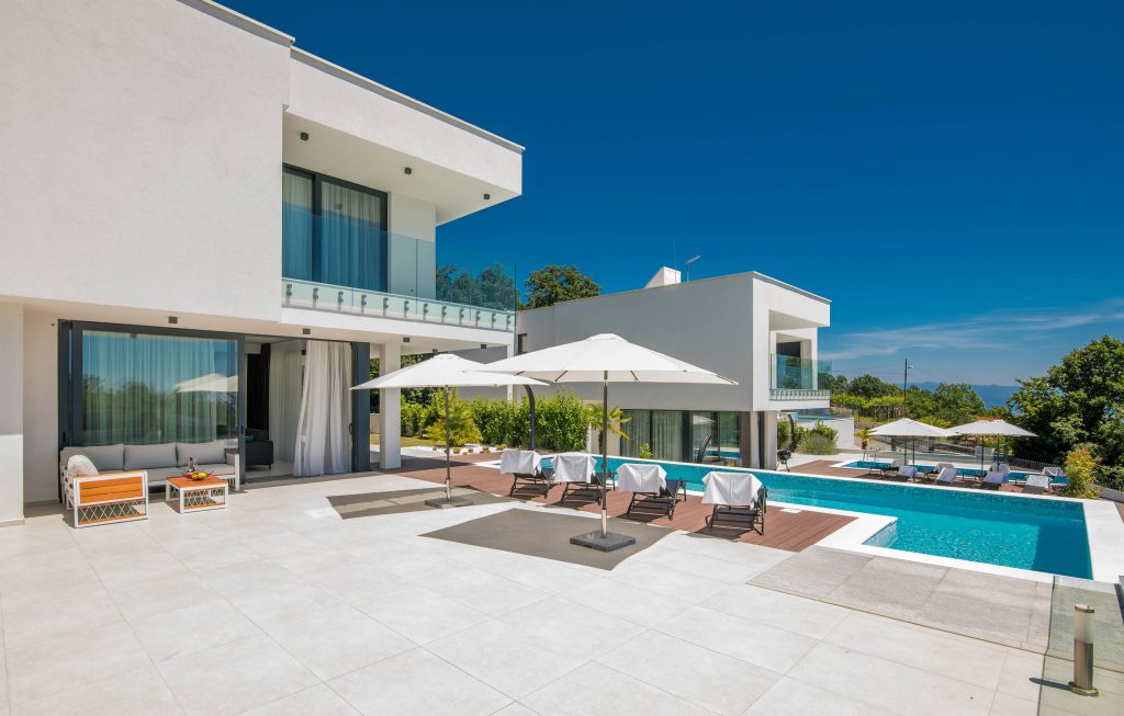 Stand-alone modern four bedroom villa with 295m2 of net living space. The upper floor bedroom terrace overlooks the Kvarner Bay and is connected to the whirlpool with breathtaking views. The villa possesses a large outdoor pool with heated water, a big pool terrace and a generous backyard. Located in the heights Kvarner Bay, Villa Infinity …