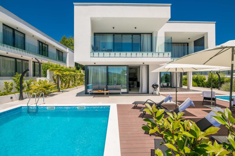 Villa Luna is a luxurious property semi attached to Villa Sole. This stunning urban retreat in Veprinac overlooking spectacular Kvarner Bay and mountain Ucka, features modern architecture and cozy atmosphere for a weekly escape from the urban life. This exclusive villa offers privacy and security with the added benefits such as large swimming pool, sun loungers, and outdoor lounge, dining areas, barbeque place, trampoline for kids and free private parking for 2 cars, From the privacy of their own villa, guests can take in spectacular sea views and enjoy the sunshine from their spacious terrace and from the living area also located on the first floor. Sea tones, whiteness, high glass doors perfectly integrate the outdoor and indoor living areas. There’s an airy, open-plan living and dining room on the ground floor, offering beautiful views throughout. The modern kitchen with fully-stocked pantry sits beside the dining room allowing for social meals. Master bedroom with en-suite bathroom and direct access to the garden is located in the back part of the ground floor and the guests can feel the cool breeze from the mountain during the whole summer. On the first floor, guests can enjoy a quiet read in the study or watch the latest blockbuster in the second living room equipped with large sofa bed. The two comfortable bedrooms are also located on the first floor, all featuring a en-suite bathroom and a private view on the back garden.